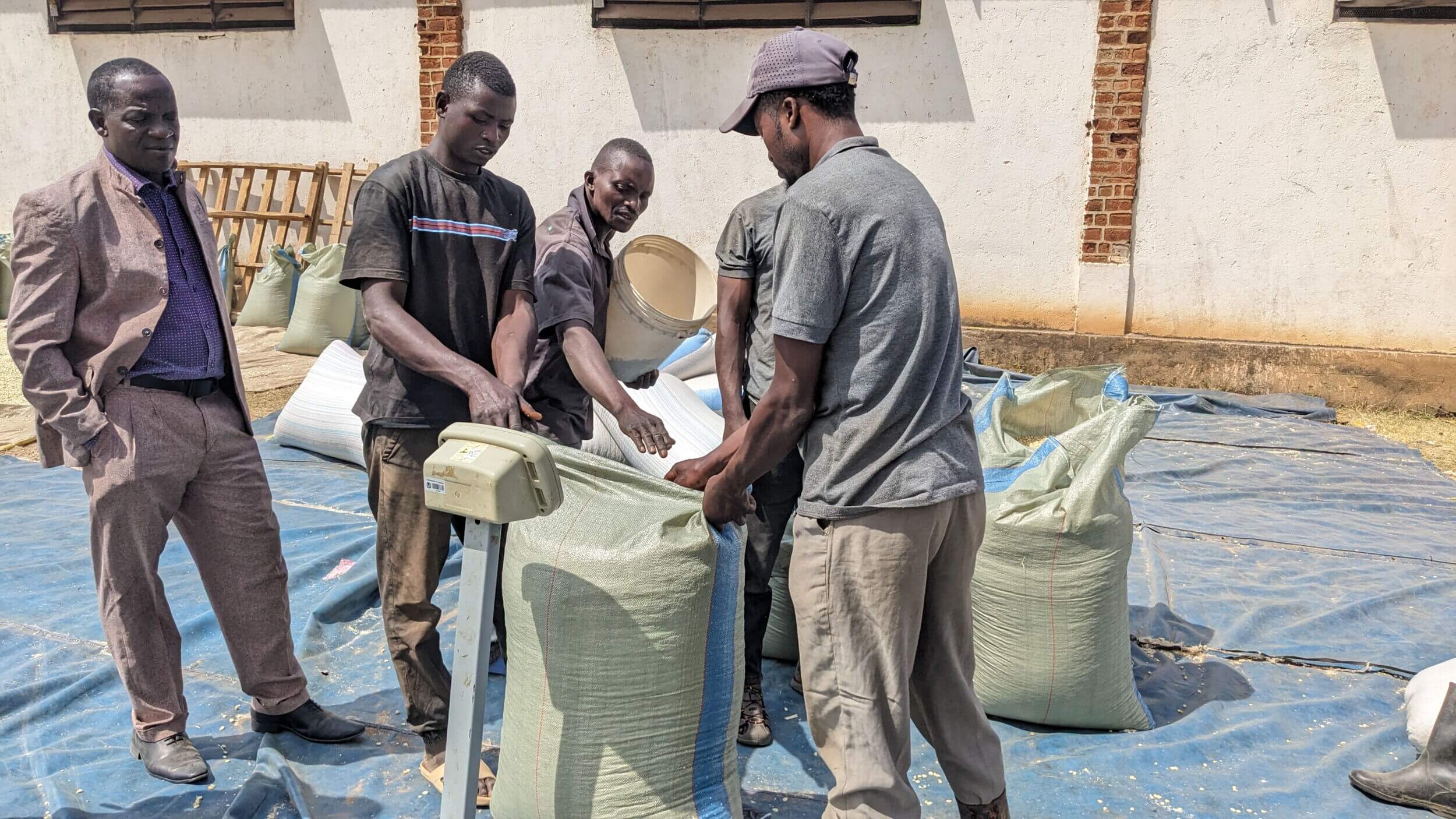 Les petits agriculteurs de Mpui AMCOS utilisent une balance numérique pour peser le maïs récolté avec précision afin d'assurer une tarification équitable et de la transparence